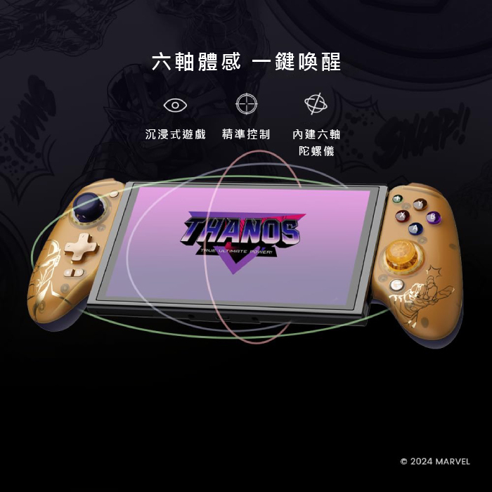 其設計風格充滿了奔放和活力,手把主體和按鈕多彩的顏色,來自於永恆之石的靈感,真切反映了綠巨人和薩諾斯的性格,別具吸引力。