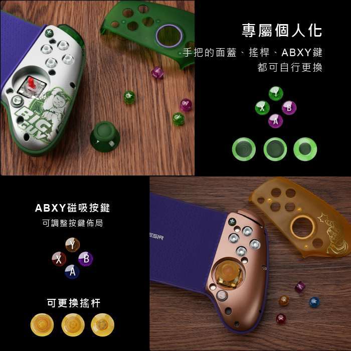 附贈3個高度不同的搖桿帽鍵,有增高型、半球型及小圓頭型,取下磁吸式握把面蓋,可隨意自行更換,體驗不同的遊戲手感。
