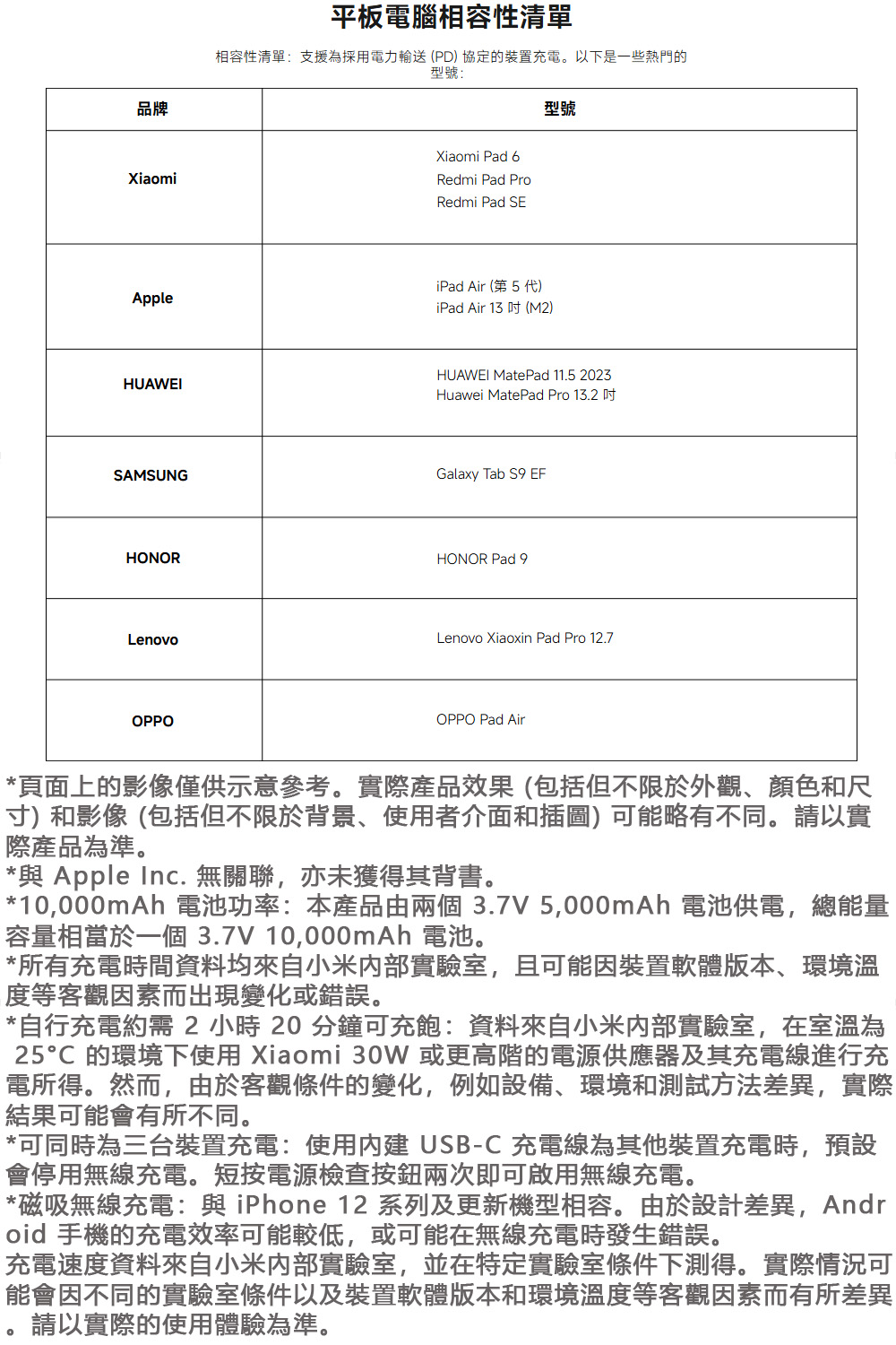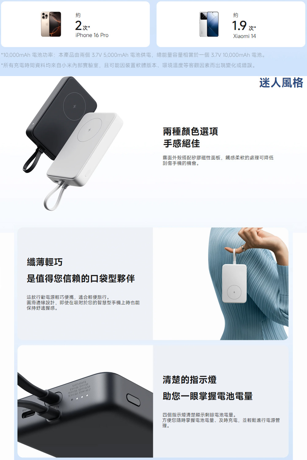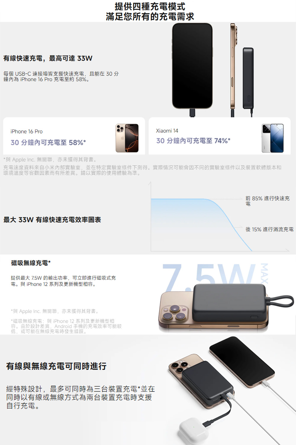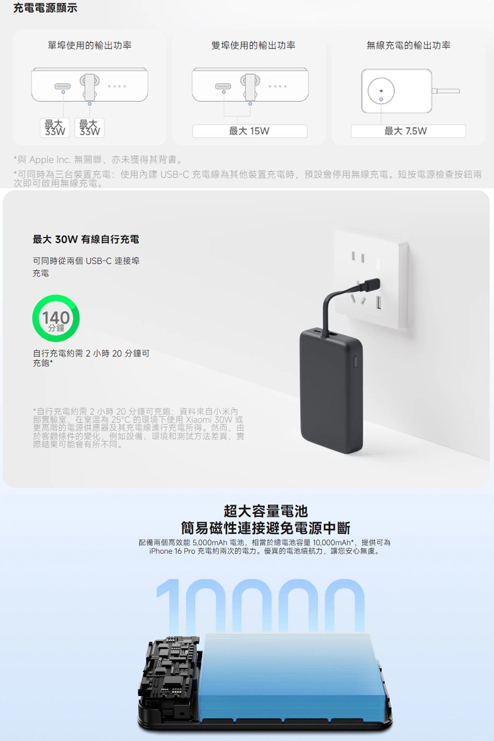 **頁面上的影像僅供示意參考。實際產品效果 (包括但不限於外觀、顏色和尺寸) 和影像 (包括但不限於背景、使用者介面和插圖) 可能略有不同。請以實際產品為準。 *與 Apple Inc. 無關聯,亦未獲得其背書。 *10,000mAh 電池功率:本產品由兩個 3.7V 5,000mAh 電池供電,總能量容量相當於一個 3.7V 10,000mAh 電池。 *所有充電時間資料均來自小米內部實驗室,且可能因裝置軟體版本、環境溫度等客觀因素而出現變化或錯誤。 *自行充電約需 2 小時 20 分鐘可充飽:資料來自小米內部實驗室,在室溫為25°C 的環境下使用 Xiaomi 30W 或更高階的電源供應器及其充電線進行充電所得。然而,由於客觀條件的變化,例如設備、環境和測試方法差異,實際結果可能會有所不同。 *可同時為三台裝置充電:使用內建 USB-C 充電線為其他裝置充電時,預設會停用無線充電。短按電源檢查按鈕兩次即可啟用無線充電。 *磁吸無線充電:與 iPhone 12 系列及更新機型相容。由於設計差異,Android 手機的充電效率可能較低,或可能在無線充電時發生錯誤。