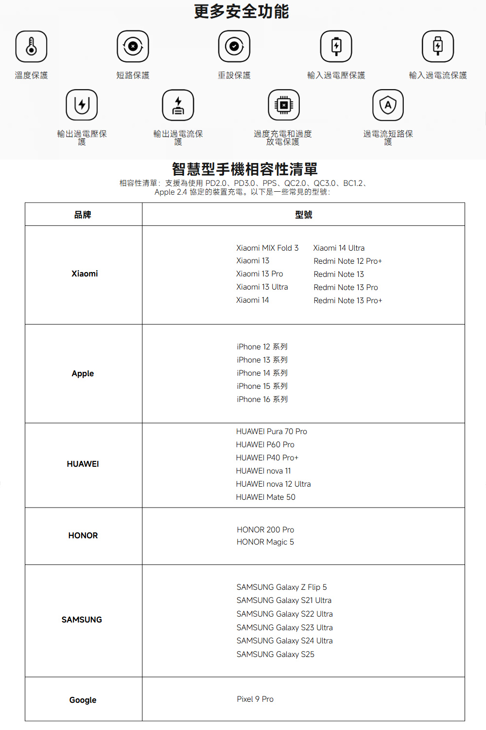 USB-C 搭配內建充電線 (OUT1) 5V⎓3A 9V⎓3A 11V⎓3A 12V⎓2.5A 15V⎓2A 33W MAX